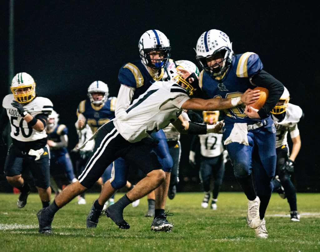 Rangers running back Nate Bock struggles for more yardage. (Photo by Reece Kimes) Santa Rosa Academy fell behind 14-0 in