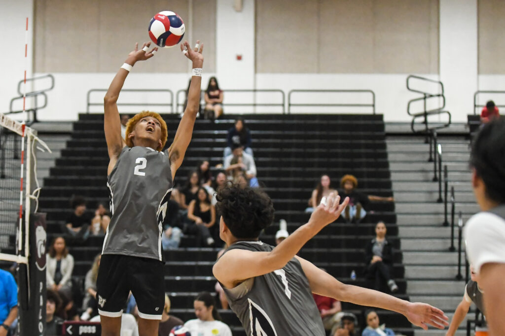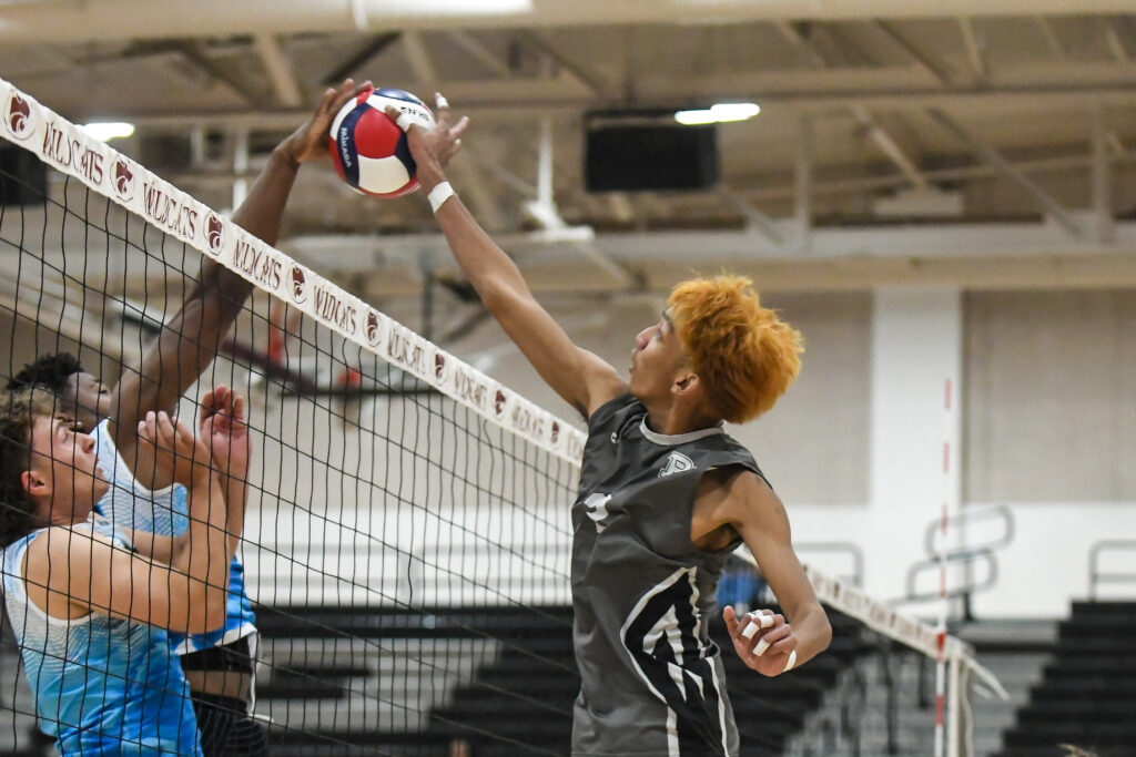 Erick Fernando (2) attacks at the net against Liberty’s Akili Kasago (10). (Photo by Action Captures Media)