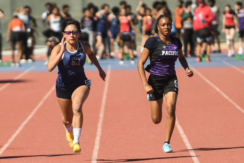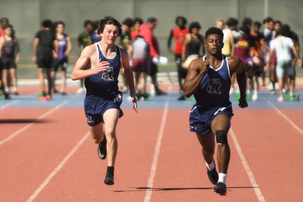 Ian Taylor and Aaron Quesada compete for Santa Rosa Academy in the boys 100. (Photo by Action Captures Media)