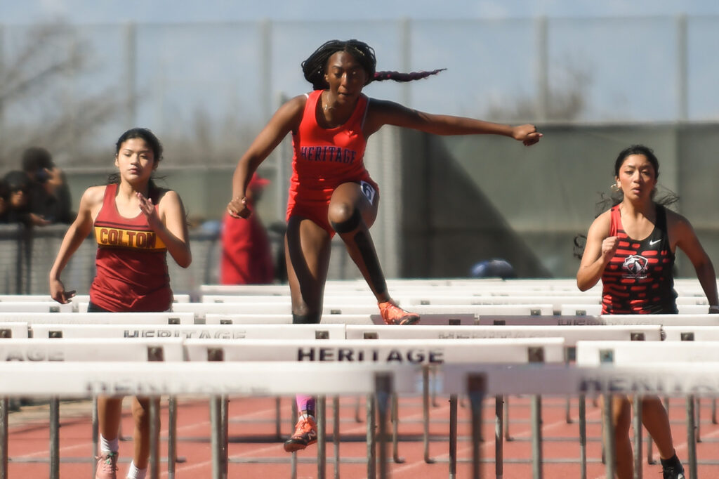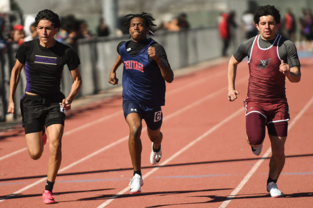 Heritage’s Jericho Owolabi competes in the boys 100. (Photo by Action Captures Media)