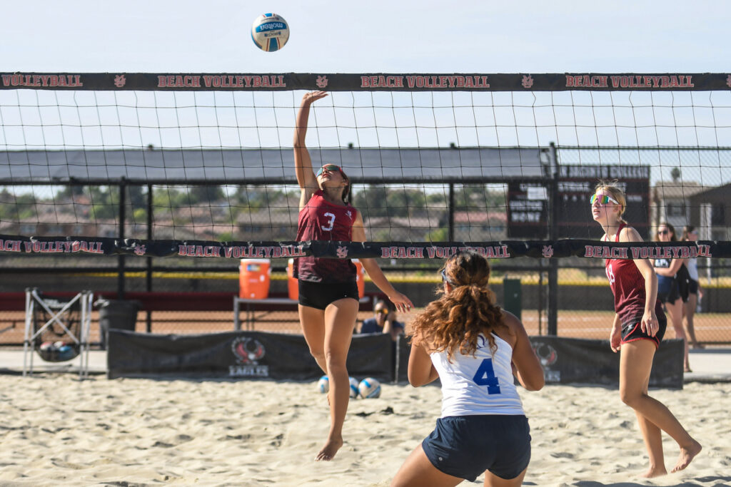Most residents probably don’t realize it, but Mt. San Jacinto College has a beach volleyball team that plays on the Menifee campus. The Eagles played two opponents today, losing 5-0 to Mira Costa and beating San Diego City, 4-1.