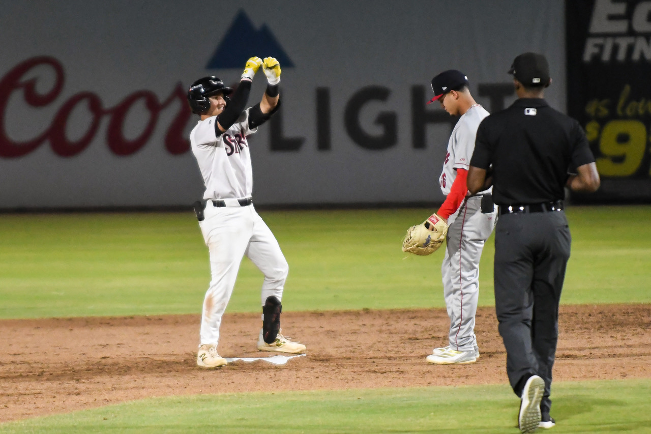 With DeCriscio on 3rd base, Houston, Texas native Conner Westenburg stepped into the batter’s box.  After working the count to 2 balls and 2 strikes, Westenburg laced a pitch into left center field that went all the way to the wall. Westenburg, who is very fast, immediately headed to 1st, then 2nd, and then 3rd, and then 15 feet or so past 3rd before putting on the brakes as the throw came to Quakes 3rd baseman Gabriel Davalillo.