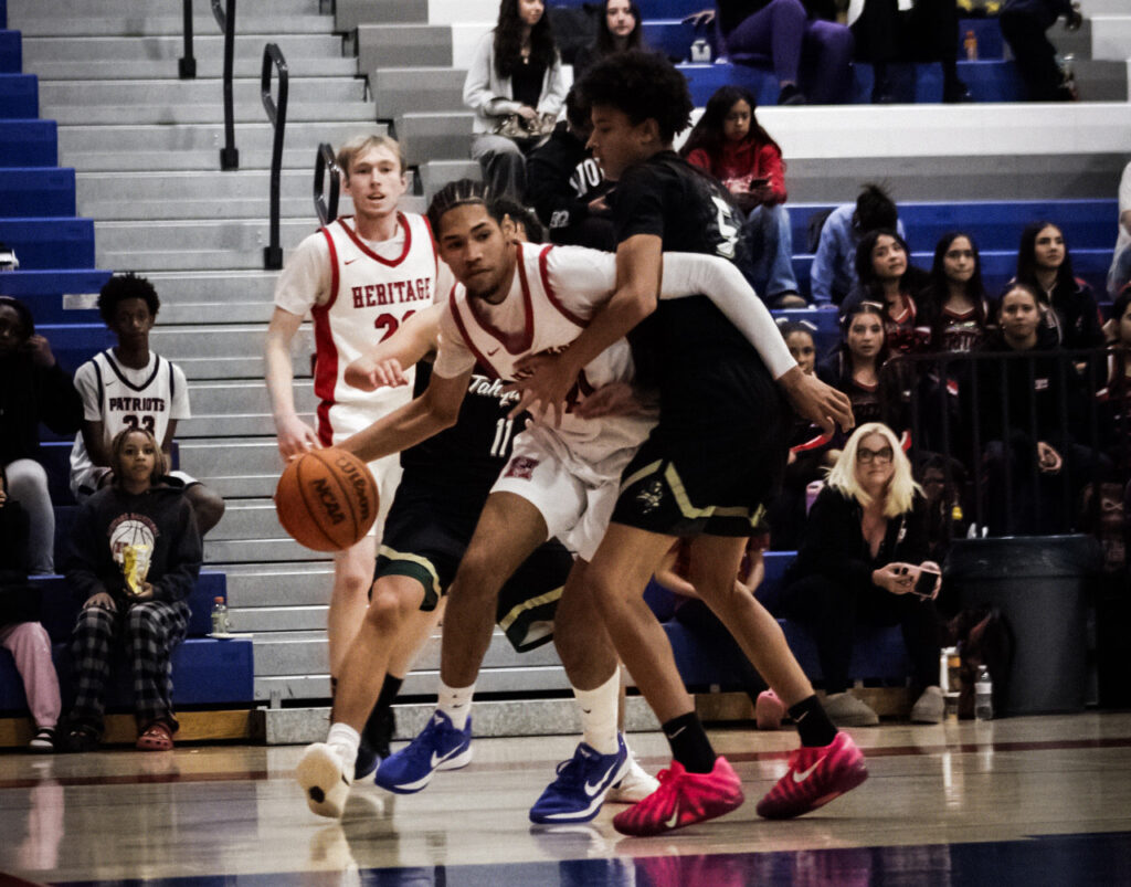 Quentin Bailey dribbles against a defender in Heritage’s victory. (Photo by Brian Thornton) Quentin Bailey accounted for 17 points, 9