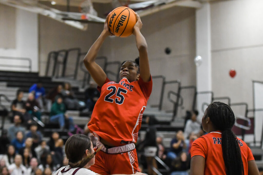 LaKaila Trimble pulls down a rebound for Heritage on Wednesday. (Photo by Action Captures Media Group) LaKaila Trimble scored 20