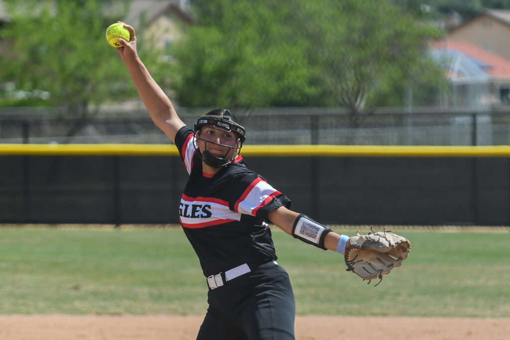 Ellianna Pasley delivers a pitch for MSJC Wednesday. (Photo by Action Captures Media) Journee Rohbok went 2 for 3 with