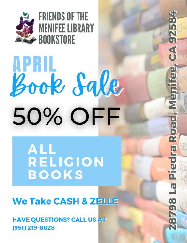 The Friends of the Menifee Library Bookstore is offering 50 percent off on religion books during the month of April.