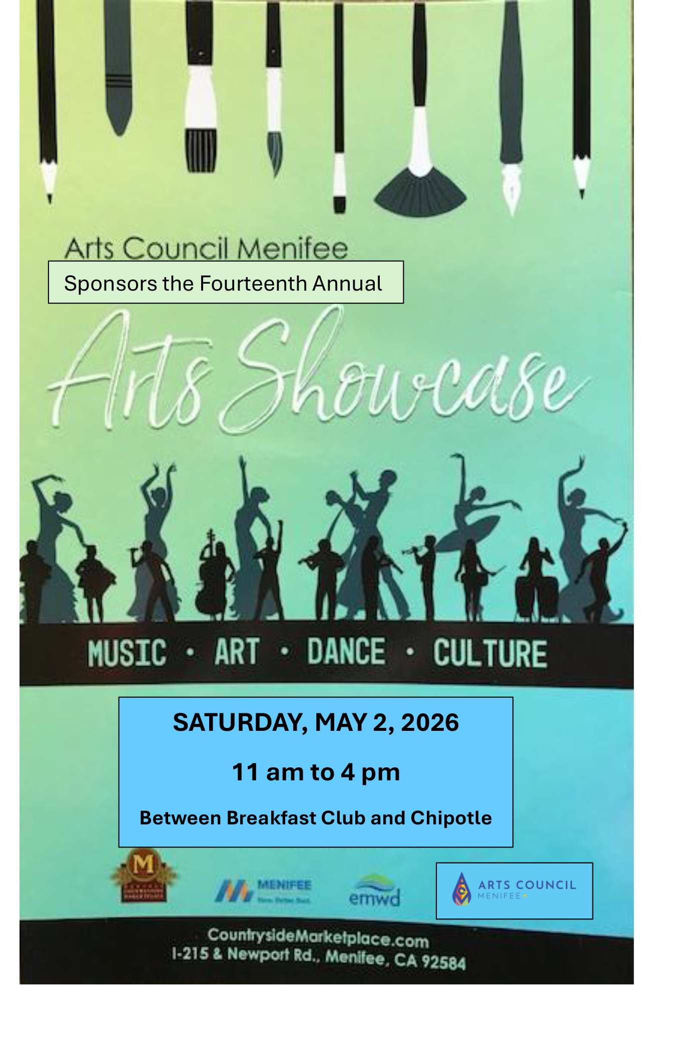 For the 14th year, Arts Council Menifee is proud to present local artists to you, the community, at the Menifee Arts Showcase on Saturday, May