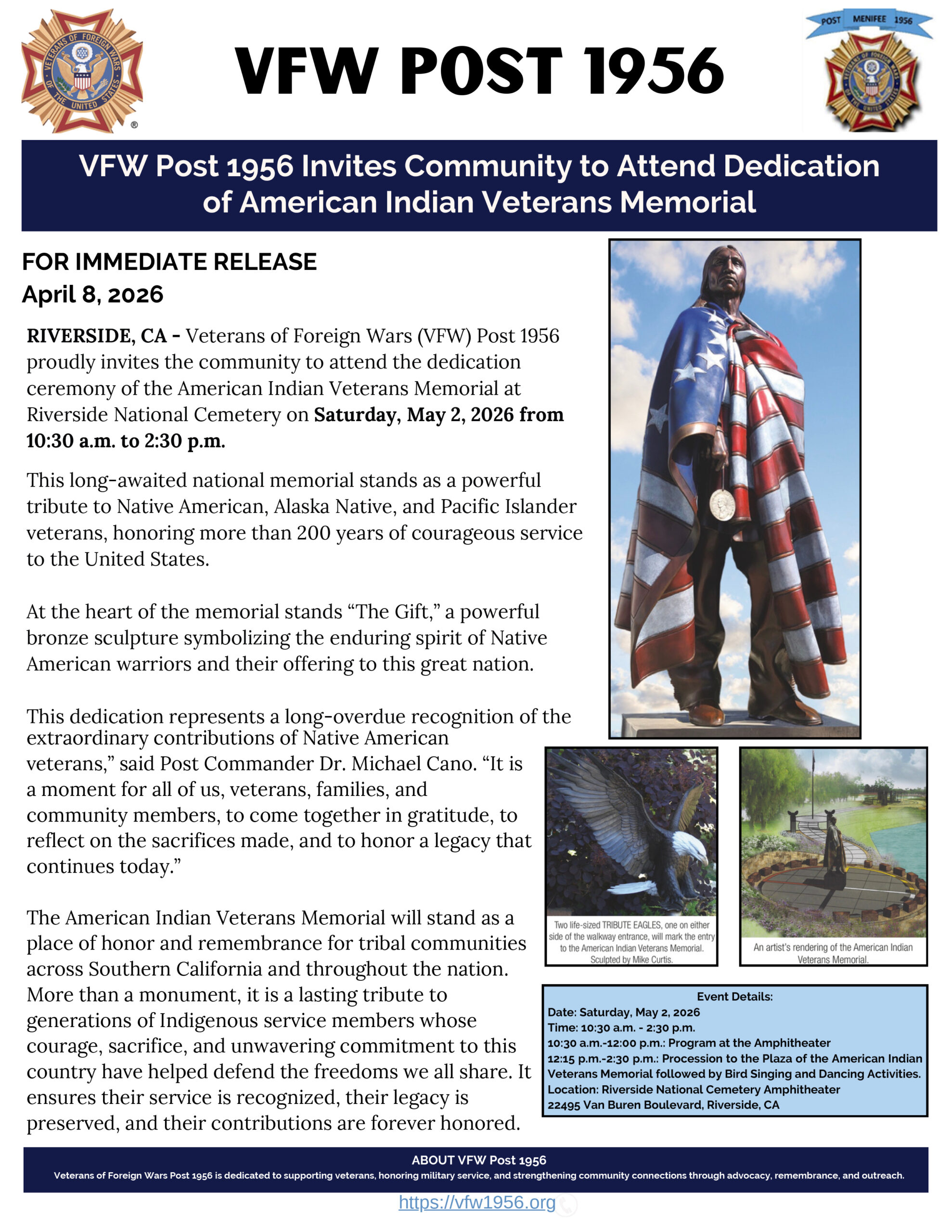 VFW Post 1956 invites the public to the dedication ceremony of the American Indian Veterans Memorial May 2 at Riverside National Cemetery. Details in the