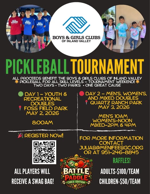 The Boys & Girls Club is launching a brand-new event, the Battle of the Paddle: Cinco Edition Pickleball Tournament, on May 2-3 in Perris and