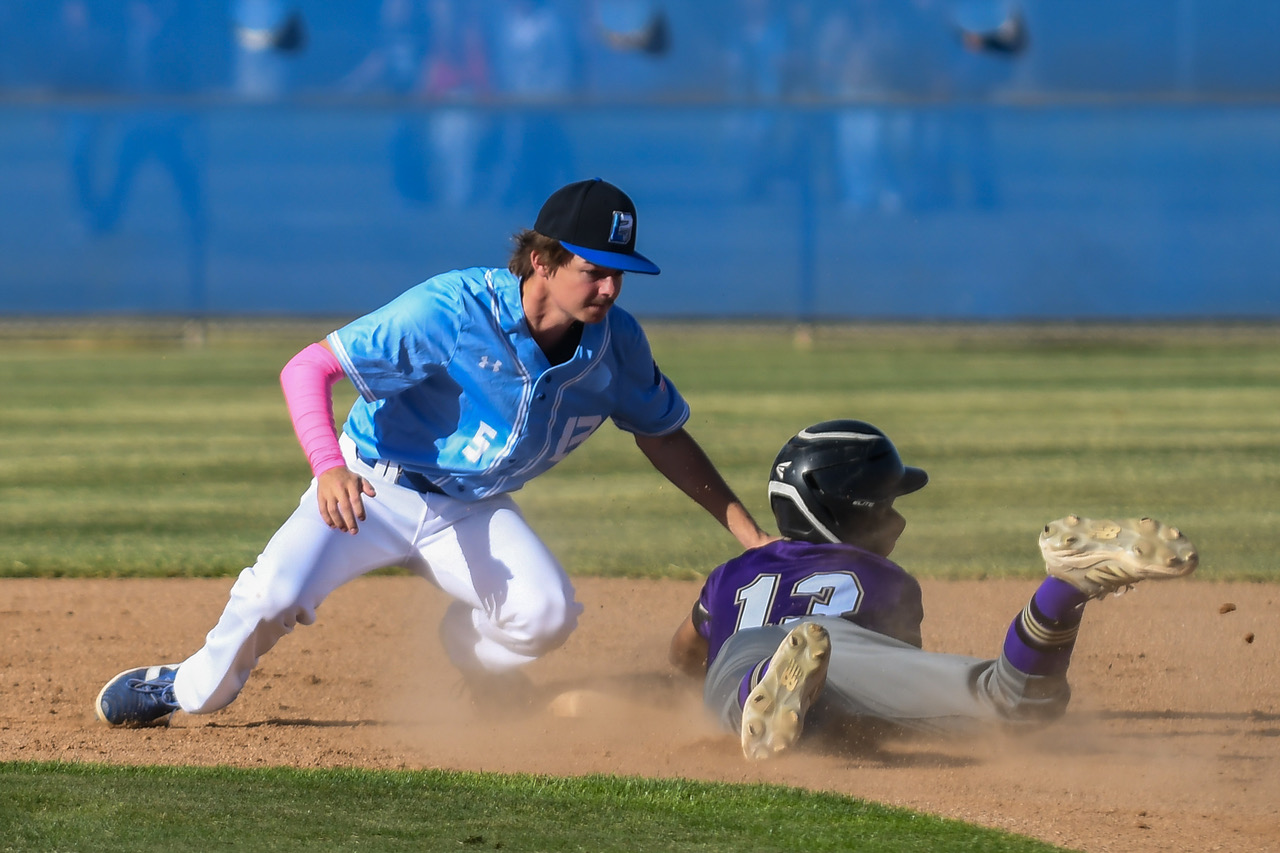 Liberty second baseman Dylan Oltjenbruns applies the tag on a Jurupa Hills runner. (Photo by Action Captures Media) Visiting Jurupa Hills scored 2 runs in