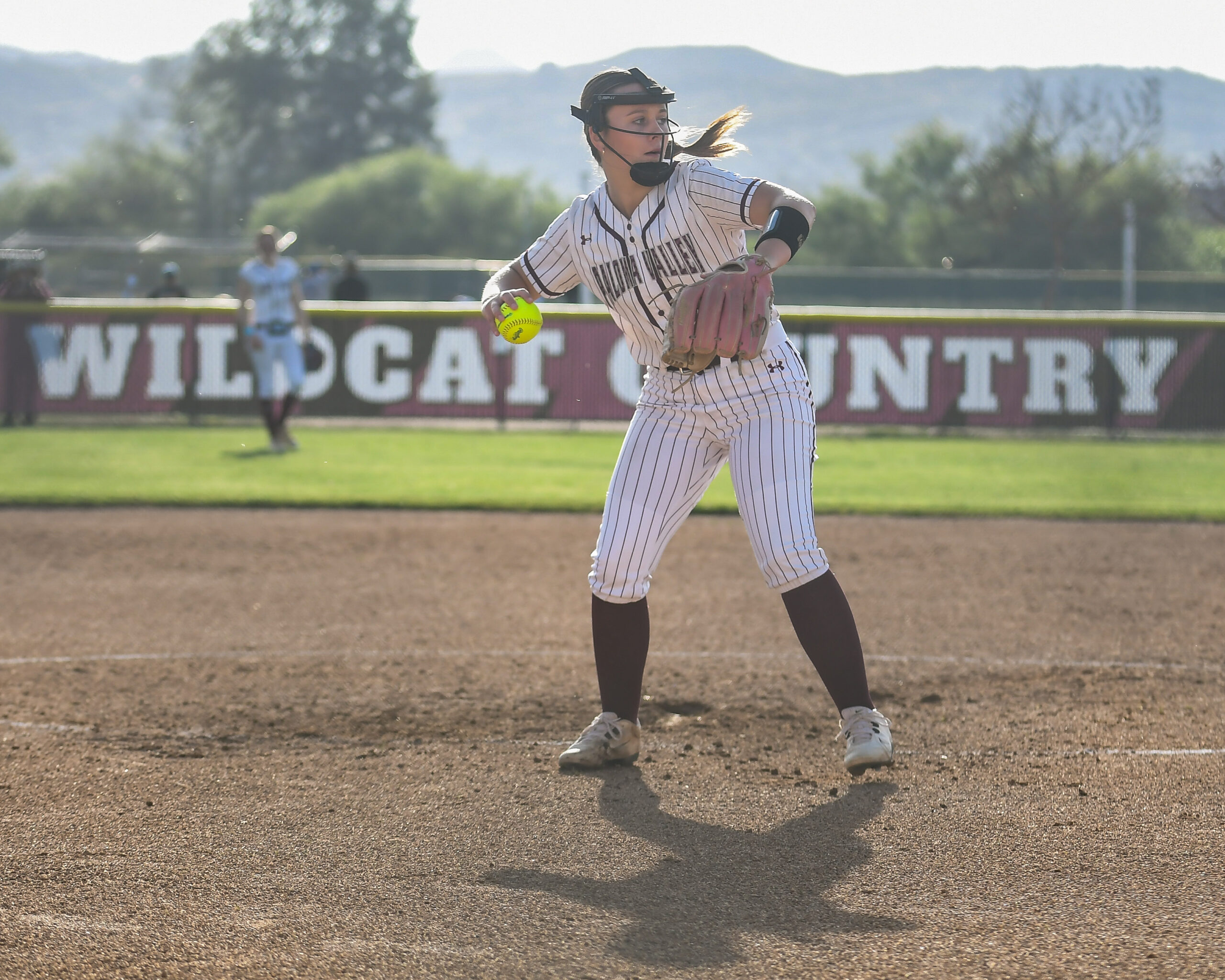Winning pitcher Kaydence Koepsell prepares to throw to first base. (Photo by Action Captures Media) Behind hot bats and great pitching from Kaydence Koepsell and